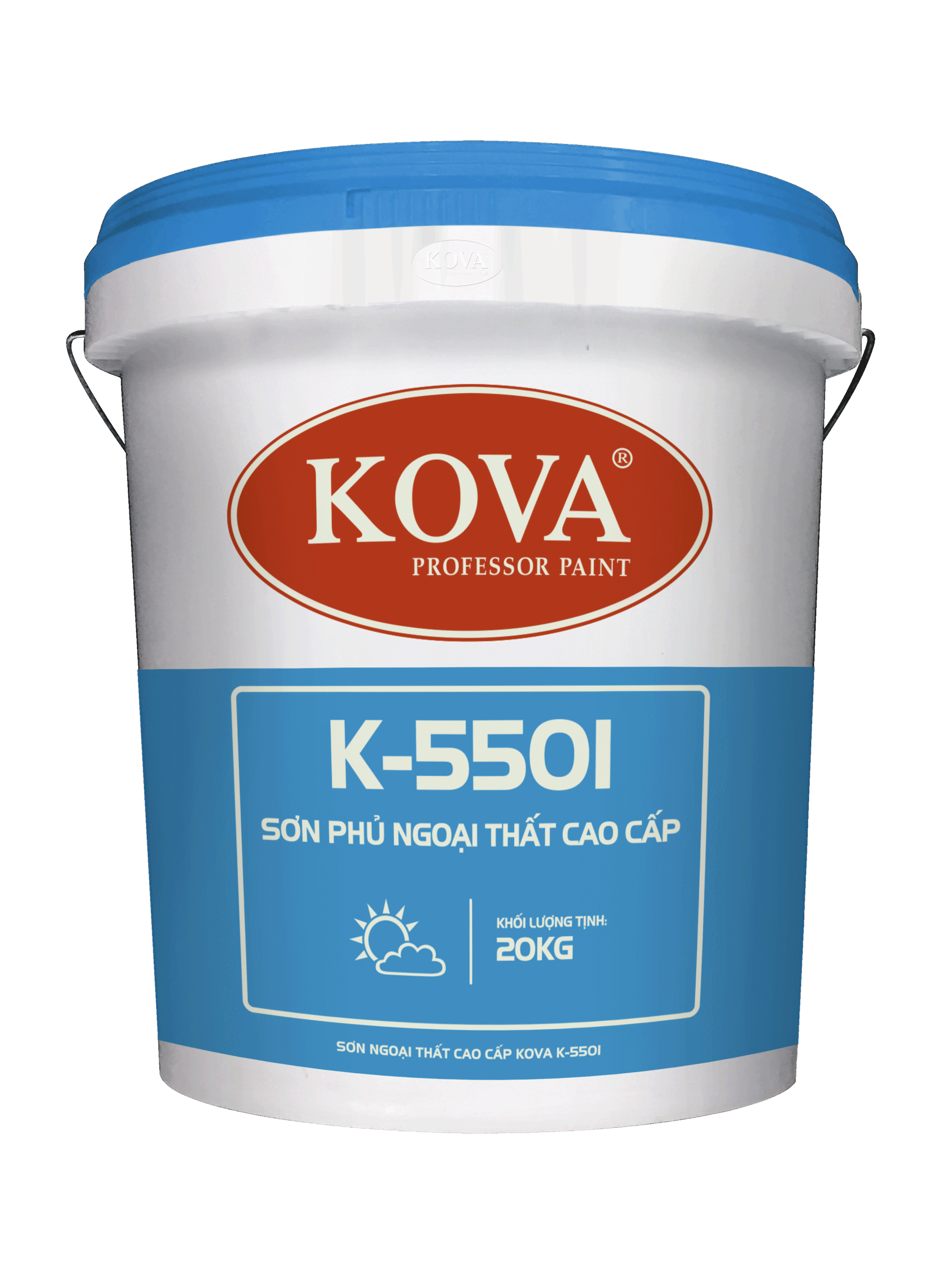SƠN NGOẠI THẤT CAO CẤP KOVA K-5501 là loại sơn cao cấp hệ Pure Acrylic phủ ngoại thất, đã hoàn toàn nhiệt đới hóa, rất phù hợp với khí hậu nóng ẩm của Việt Nam. Dùng để chống thấm và trang trí ngoại thất của tường bê tông, vữa, xi măng sau khi đã dùng mastic dẻo, bột trét để làm phẳng và được phủ sơn lót ngoại thất kháng kiềm, hoặc thi công trực tiếp lên CT-11A Plus Tường.