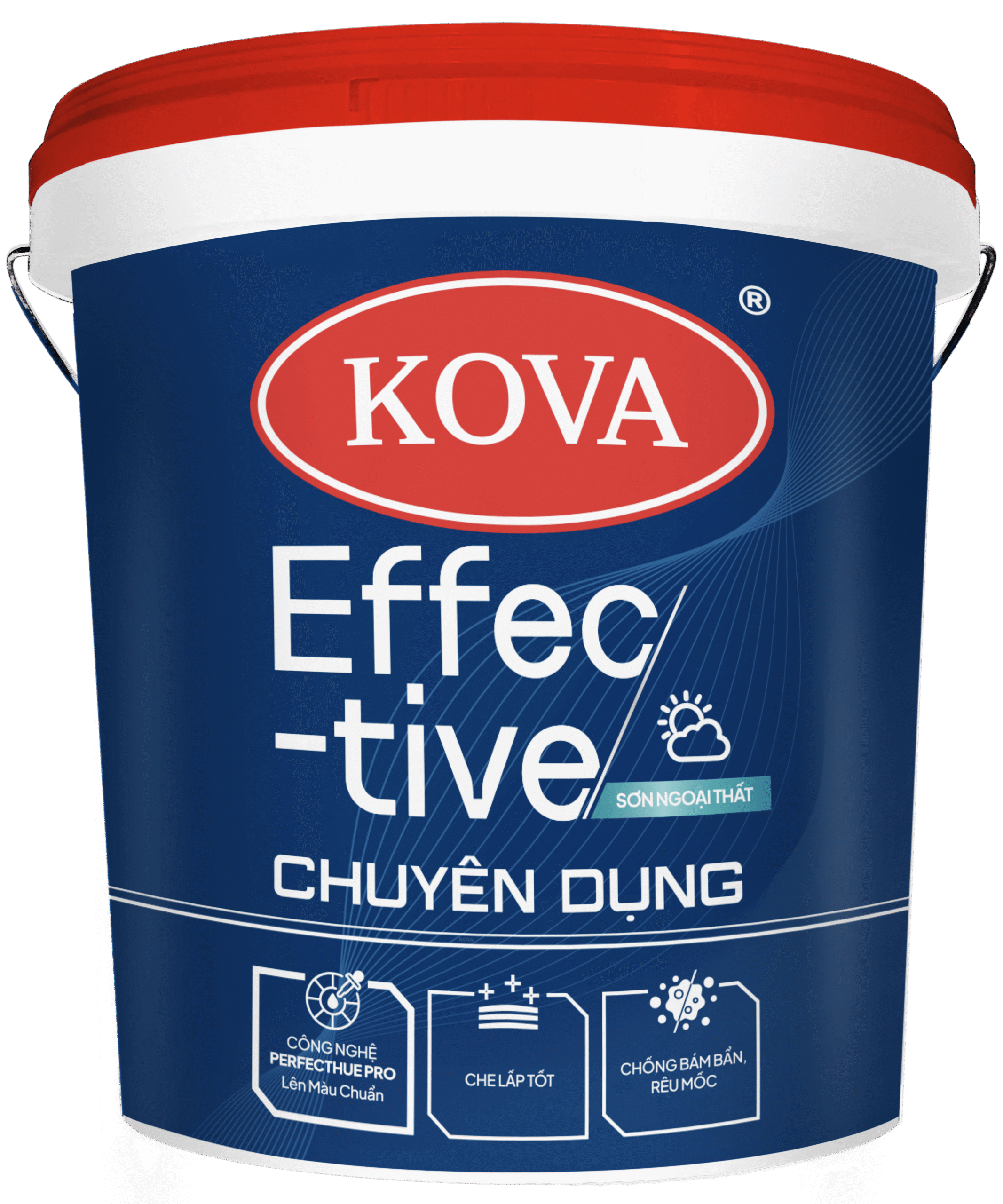 Sơn ngoại thất KOVA Effective Chuyên Dụng là sơn nước gốc Acrylic với màng sơn có kết cấu chặt chẽ chống bụi bẩn bám dính và đi sâu vào bên trong. Công nghệ PerfectHue Pro giúp màng sơn lên màu chuẩn, đẹp. Bề mặt sơn mịn màng, dễ thi công phù hợp với nhiều loại bề mặt tường công trình.